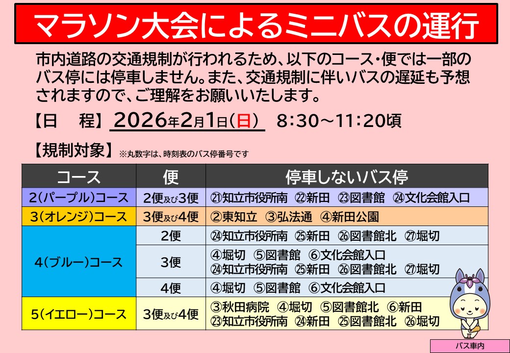 交通規制により、次のミニバスは迂回し、記載されたバス停には停車しませんのでご注意ください。また、バス到着の遅れが予想されますので、ご理解、ご協力をお願いします。