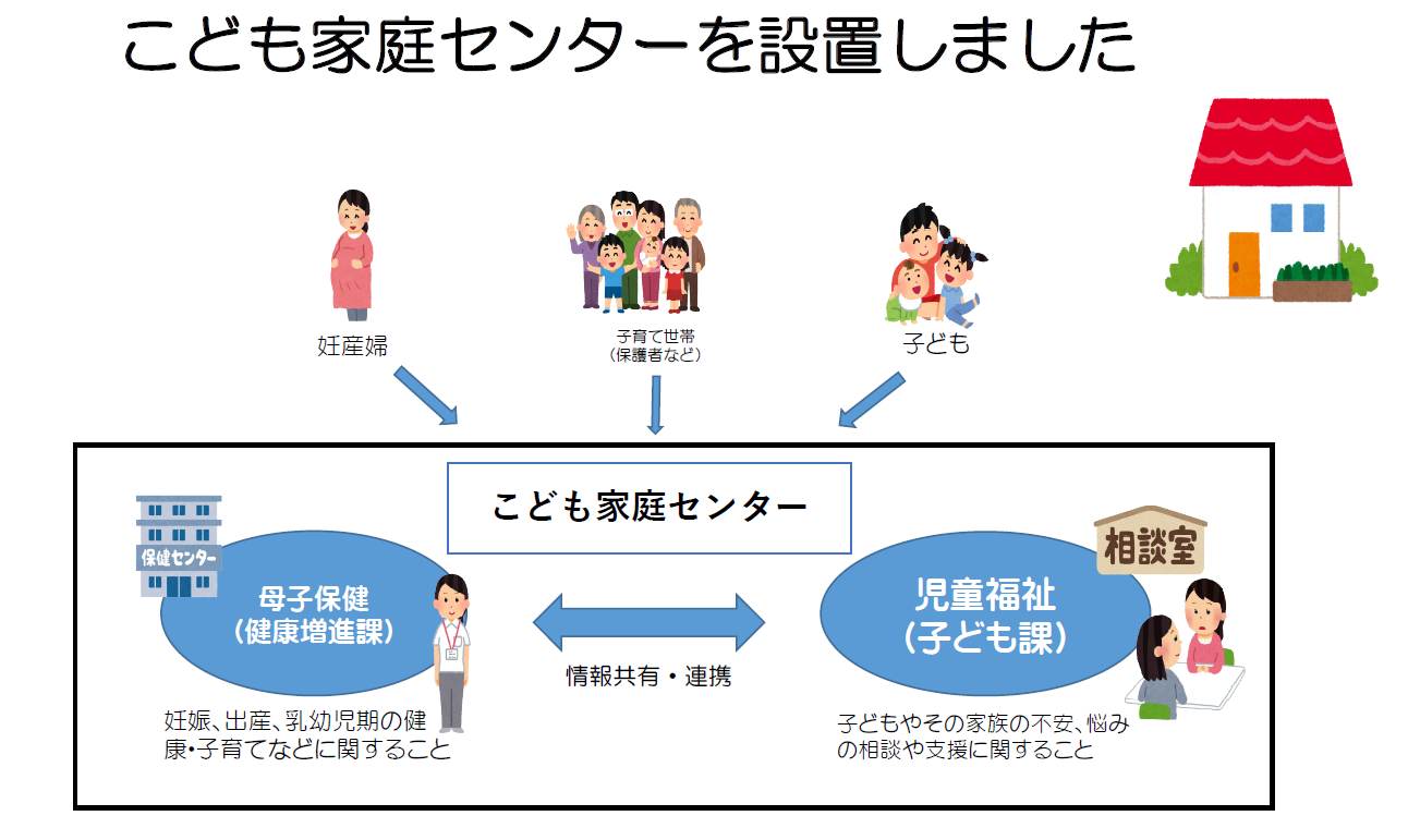 令和7年4月から、母子保健と児童福祉の連携や相談体制を強化した「こども家庭センター」を設置しました。すべての妊産婦、子育て世帯、子どもの相談に対して、関係機関と連携しながら、個々のケースに応じた一体的な支援を行います。