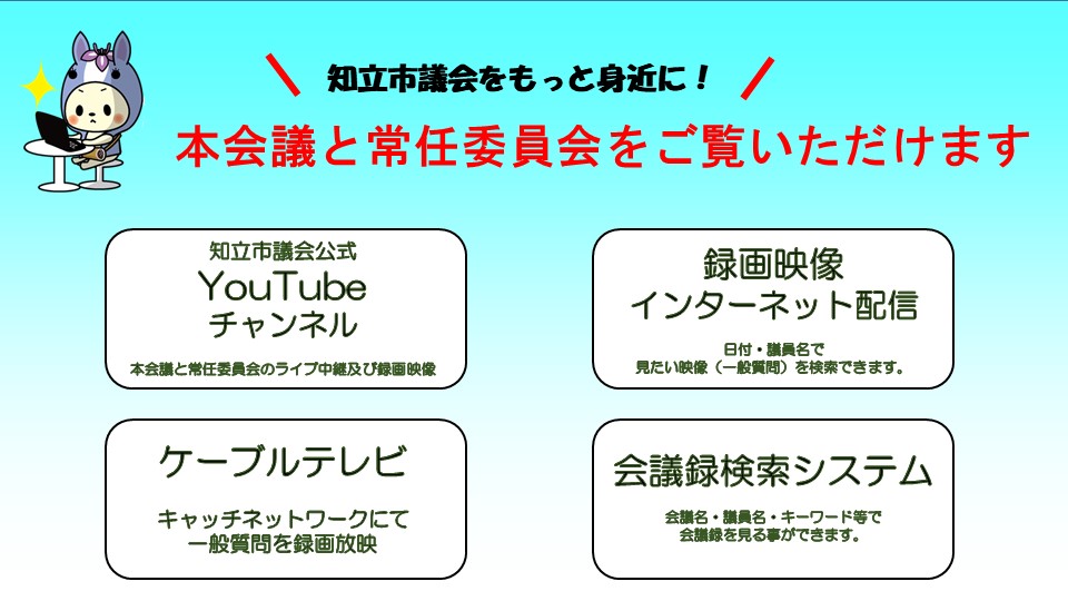 本会議(開会・質疑・一般質問・閉会)及び常任委員会(企画文教委員会・市民福祉委員会・建設水道委員会・予算、決算委員会)について、Youtube(ユーチューブ)「知立市議会公式チャンネル」にてライブ中継を実施しております。