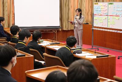 昨年に引き続き、法政大学法学部の土山希美枝教授をアドバイザーとしてお招きし、第1部では、高校生からの知立市に実現したいこと、必要な政策についての提案発表を受けました。第2部では市内の高校3校から参加した高校生31名と市議19名が第1部での提案発表について意見交換を行い、アドバイザーの土山教授から意見交換を踏まえた提案発表に対する実現性などについてアドバイスがありました。