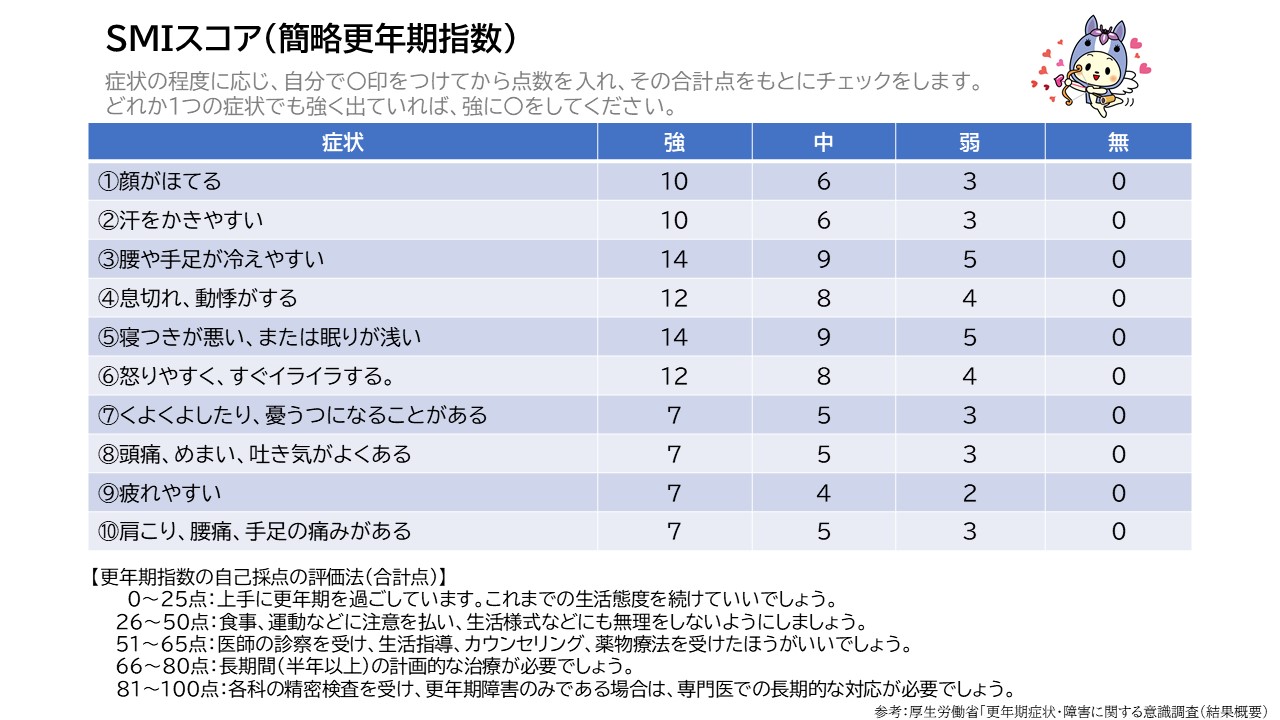 SMIスコア(簡略更年期指数)をご存じですか 更新日:2025年12月24日 ご自身の現在の体の状況を客観的に捉えるチェック表です。 医療機関を受診する目安にしていただくこともおすすめします。 女性の健康について 健康増進課 成人保健係〒472-0031愛知県知立市桜木町桜木11-2知立市保健センター電話:0566-82-8211ファックス:0566-83-6591メールフォームでのお問い合わせはこちら