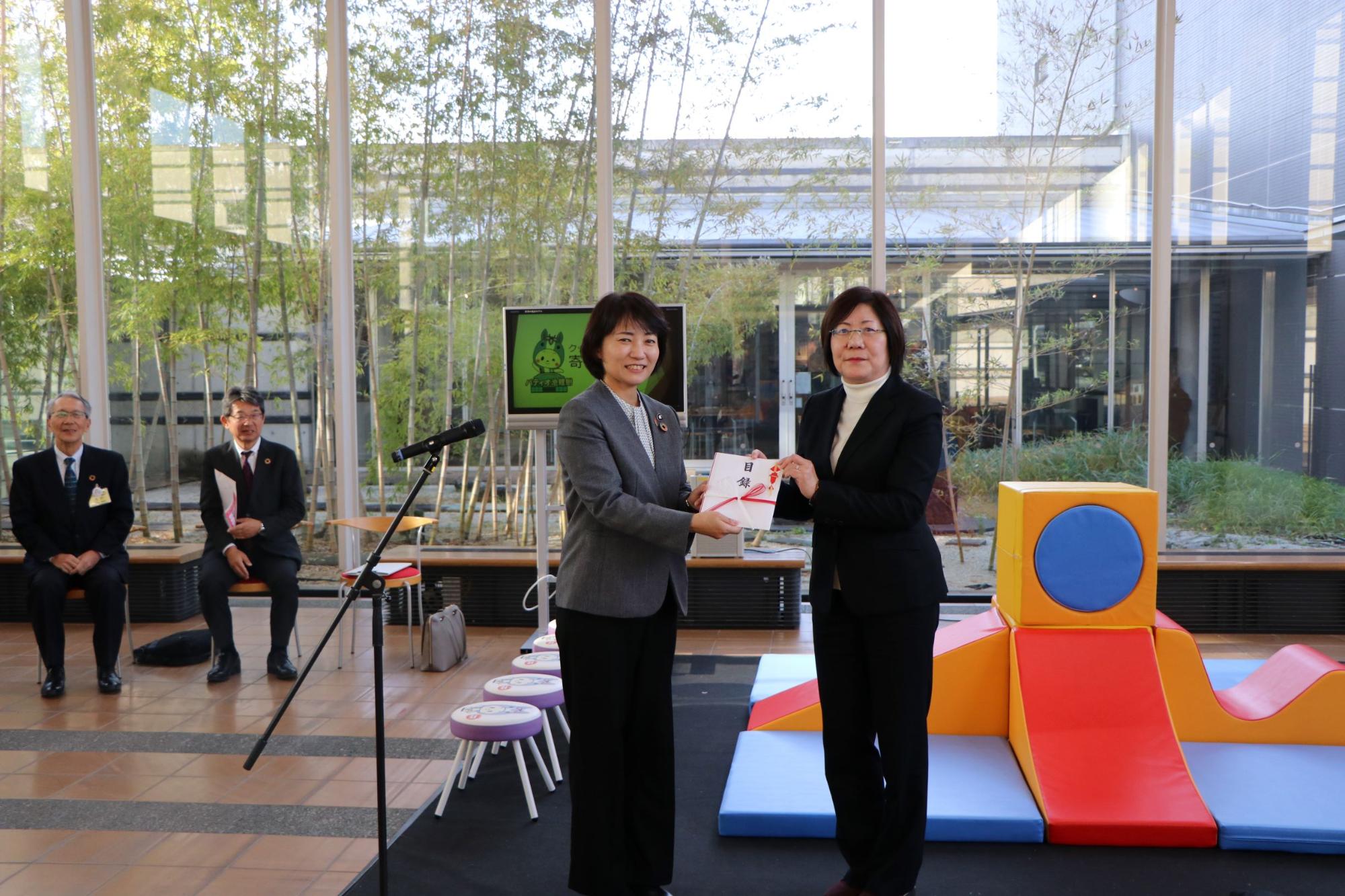 寄附贈呈式は大勢の子どもたちに囲まれながら行われました。石川市長は「子どもたちを温かく出迎え、だれもが気兼ねなく文化芸術を鑑賞できる環境づくりに役立つものと期待しています。四半世紀にわたる貴協会の取り組みに感謝申し上げると共に、今後のご発展を祈念します。」とあいさつをされました。