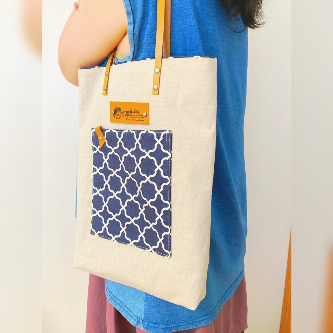 シンプルでナチュラルな雰囲気の縦型トートバッグを作ります。持ち手に本革を使用しているので上質感と耐久性があります。A4サイズもすっぽり入る大容量ですが、すっきりしたフォルムで肩にも掛けられる便利なバッグです。